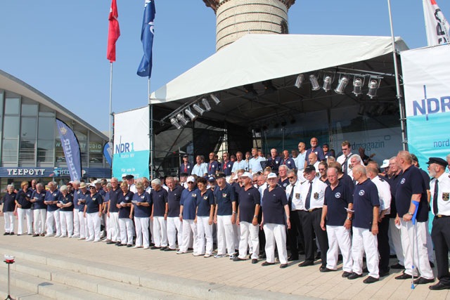 Dafür kamen noch einmal alle 180 Shanty-Sängerinnen und Sänger unter dem Warnemünder Leuchtturm zusammen. Da bei dem diesjährigen Shantytreffen aber alles viel zu hoch war, die Temperaturen und das Durchschnittsalter der Chormitglieder, entschloss man sich das ursprünglich für eine Stunde geplante Programm auf vier Titel zu verkürzen. Auch wenn auf dem Wasser Flaute herrschte, die Schunkelwellen des Publikums waren nicht zu übersehen.