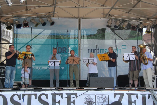 Aloha He – hieß es dann ab 10 Uhr auf der kleinen Bühne unter dem Leuchtturm. Bei glühend heißem Sonnenschein quetschte sich hier eine Reihe von Shanty-Fans unter die Schatten spendenden Schirme. Eröffnet wurde das Treffen mit Fanfaren vom Posaunenchor der evangelischen Gemeinde in Warnemünde.